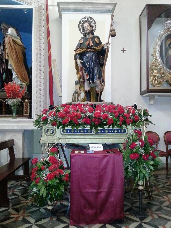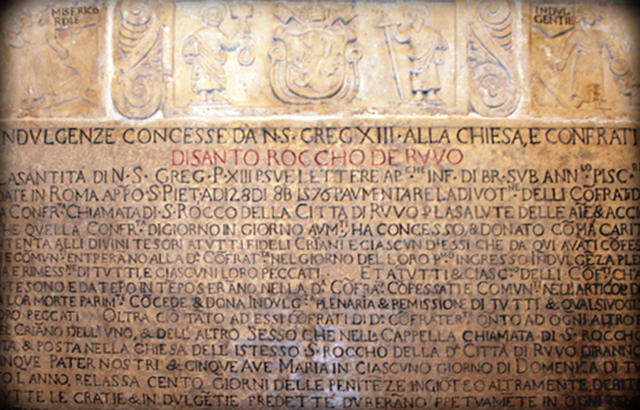 La testimonianza della Confraternita si evince dalla lapide con bassorilievi, inscritta sul lato nord della chiesa dove sono elargite le indulgenze concesse da Papa Gregorio XIII, il 28 ottobre 1576, tale iscrizione colloca la congrega di San Rocco come più antico sodalizio della città.